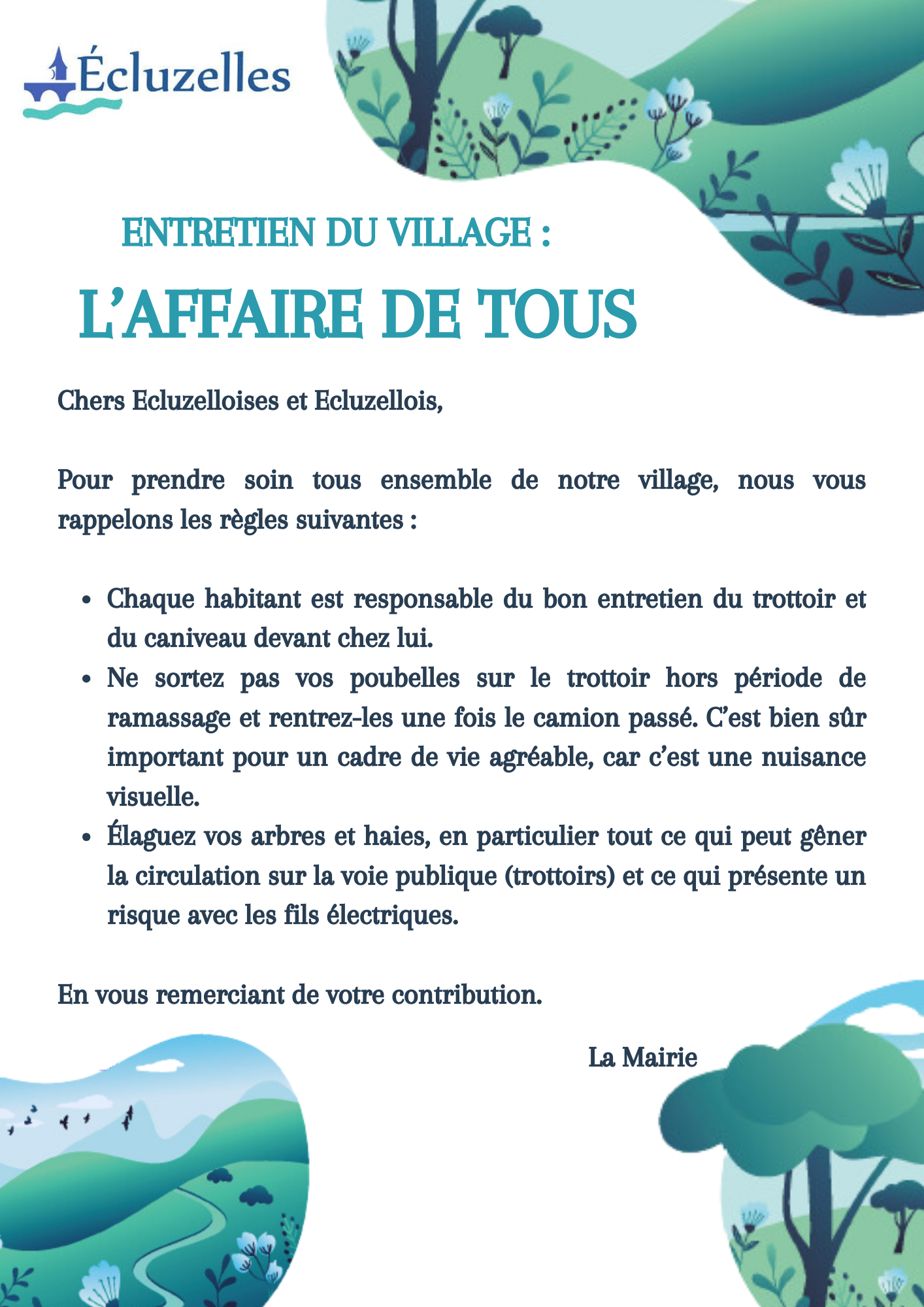 L'entretien du village est l'affaire de tous24/10/2024 Prenons soin ensemble du village avec quelques simples règles de bon savoir-vivre.