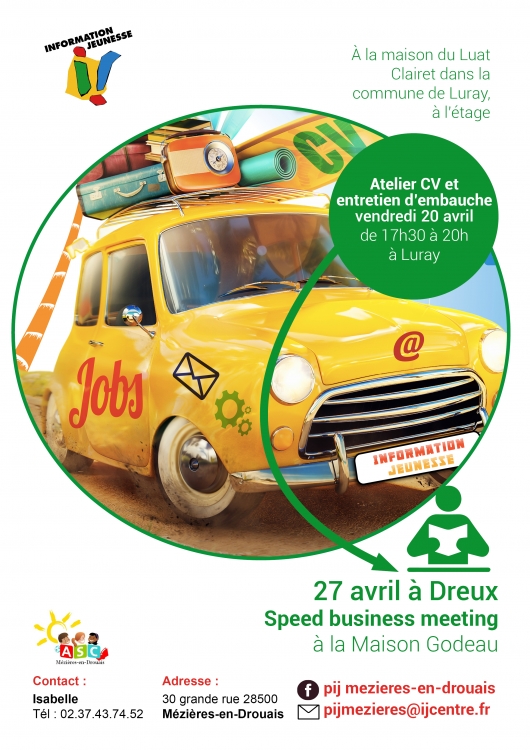 Pour les jeunes : journée Job d’été de Dreux18/04/2018 Cette année, votre PIJ de Mézières-en-Drouais s’est associé avec le BIJ de Dreux, pour que les jeunes de nos communes puissent participer à la journée Job d’été de Dreux